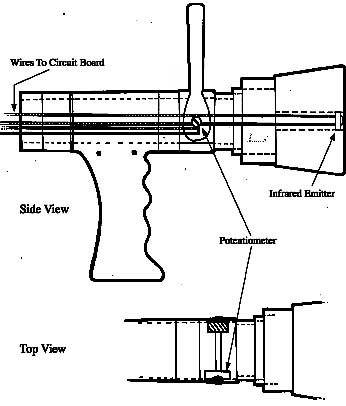 Figure 40. WordNozzle Installation. Schematic of customized hose-nozzle, showing where the infrared emitter used for spatial location and the potentiometer used for controlling flow are located within the nozzle. | ||||||